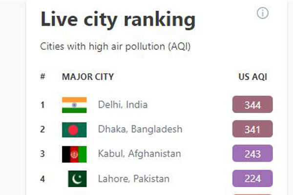বৈশ্বিক দূষিত শহরের তালিকায় এক নম্বরে আছে ভারতের দিল্লি। দুই নম্বরে ঢাকা। তৃতীয় অবস্থানে আফগানিস্তানের রাজধানী কাবুল। ঢাকার প্রতি ঘনমিটার বাতাসে সুক্ষ ধূলিকণা ছিল ৩৪১ মাইক্রোগ্রাম।