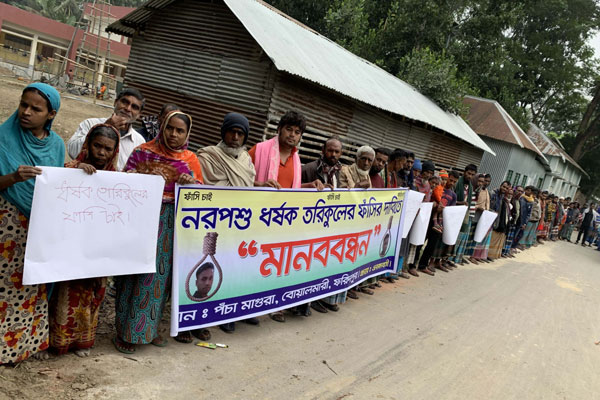 জেলার বোয়ালমারী উপজেলার রূপাপাত ইউনিয়নের পঁচামাগুরা গ্রামের ধর্ষক তরিকুল ইসলামের (২২) ফাঁসির দাবিতে মানববন্ধন করেছে নির্যাতিত পরিবার ও স্থানীয় বাসিন্দারা। বৃহস্পতিবার দুপুরে পঁচামাগুরা সরকারি প্রাথমিক বিদ্যালয়ের সামনে বনমালিপুর সড়কে এ মানববন্ধন অনুষ্ঠিত হয়। মানবন্ধনে নারী-পুরুষসহ তিন শতাধিক লোকজন অংশ নেয়। মানববন্ধনে বক্তব্য রাখেন ওই ইউনিয়নের ৪, ৫ ও ৬ নম্বর ওয়ার্ডের সংরক্ষিত ইউপি সদস্য ফিরোজা বেগম, ধর্ষিতার মা-বাবা, ব্যবসায়ী মিলন মোল্যা, ছাত্রলীগ নেতা মারুফ হোসাইন, জয়নগর দাখিল মাদ্রাসার দপ্তরি শাহিদ খান প্রমুখ। এ সময় বক্তারা ধর্ষক তরিকুলের ফাঁসি দাবি করে অন্য আসামিদের সঠিক বিচার চেয়েছেন। মামলা ও এলাকা সূত্রে জানা গেছে, উপজেলার রূপাপাত ইউনিয়নের পঁচামাগুরা গ্রামের বাকা মোল্যার ছেলে তরিকুল ইসলাম প্রতিবেশি ছাত্রীকে স্কুলে আসা যাওয়ার পথে প্রেমের প্রস্তাবসহ নানাভাবে উত্যক্ত করতো। ওই কিশোরী গোপালগঞ্জের কাশিয়ানী উপজেলার জয়নগর বালিকা বিদ্যালয়ের ছাত্রী। চলতি বছরের ৫ এপ্রিল বিকেলে ওই কিশোরীর বাড়ির পাশের বাগানে লাকড়ি আনতে গেলে লম্পট তরিকুল তাকে জোরপূর্বক ধর্ষণ করে। এ ঘটনায় কিশোরীর মা গত ১ মে তরিকুল, তার ভাই জুয়েল মোল্যা (৩৫), বারিক মোল্যা (৩২), তরিকুলের বাবা বাকা মোল্যা (৬০) ও বারিক মোল্যার স্ত্রী সনিয়া বেগমকে (২৬) আসামি করে বোয়ালমারী থানায় নারী ও শিশু নির্যাতন দমন আইনে মামলা করেন। ওই মামলায় ধর্ষক তরিকুল বর্তমানে জেল হাজতে থাকলেও বাকি ৪ আসামি জামিনে থেকে বাদী ও বাদীর পরিবারকে নির্যাতন করছে এবং প্রাণে মেরে ফেলার হুমকি দিচ্ছে বলে জানা গেছে। এ ব্যাপারে মামলার তদন্তকারী কর্মকর্তা থানার উপ-পরিদর্শক শাহাদত হোসেন বলেন, ধর্ষণের ঘটনায় চার্জশিট দেওয়া হয়েছে। ধর্ষণের ঘটনাটি সঠিক। ধর্ষকের পরিবার প্রভাবশালী হওয়ায় বাদীদের উপর নির্যাতন করতে পারে। মারধরের ঘটনায় আরেকটি মামলাও হয়েছে। আশা করি নির্যাতিত পরিবার ন্যায় বিচার পাবে।
